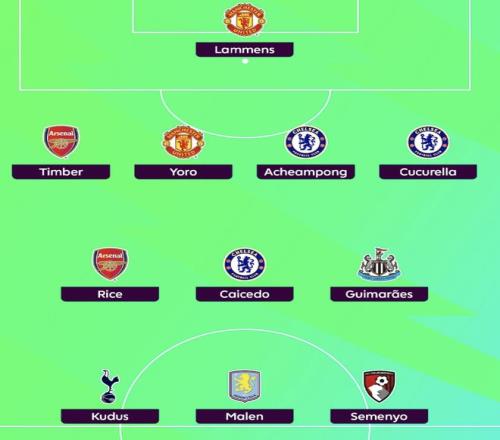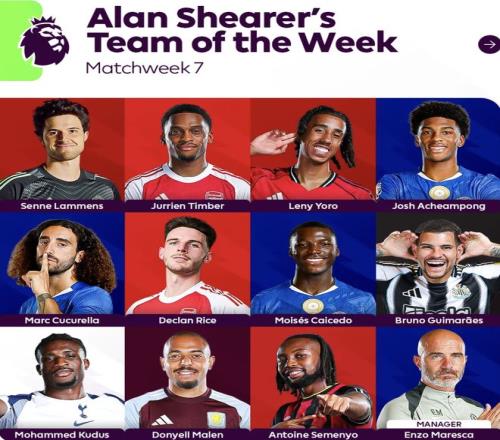雷速体育10月6日报道宣称 英超第7轮战罢,英超官方公布了阿兰·希勒评选的第7轮最佳阵容,切尔西有三名球员入选,曼联、阿森纳则各有两员。
