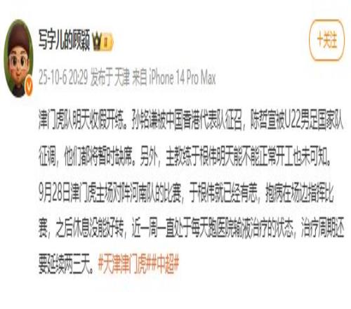 津门虎队今天的训练将以恢复、调整为主,主教练于根伟能否出现在训练场,其实也还是未知数。据了解,实际上9月28日主场对阵河南队的比赛,于根伟就已经有恙,抱病在场边指挥比赛,也是因为一直坚持,情况反而更加严重,过去一周多的假期,他一直处于每天跑医院输液治疗的状态,治疗周期到今天还没有结束,不过他本人早些时候也表示,自己会尽量不耽误出勤。