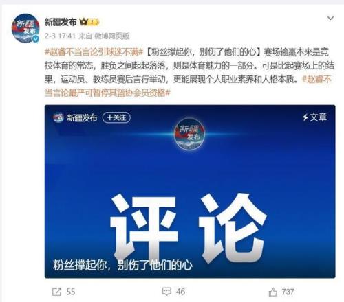在2月3日下午新疆官方媒体“新疆发布”连续发布了两条关于赵睿的消息,一方面是表达了自己的立场,坚决维护祖国统一和民族团结,另一方面也对赵睿这次不当的言行进行了抨击。“新疆发布”发文说“粉丝撑起了你,别伤了他们的心。赛场输赢本来是竞技体育的常态,胜负之间起起落落,则是体育魅力的一部分。可是比起赛场上的结果,运动员、教练员赛后言行举动,更能展现个人职业素养和人格本质”。