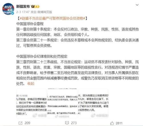 另外“新疆发布”还转载了中国篮球协会章程,以及中国篮球协会纪律准则和处罚规定。其内容明确表示任何球员不得有以下这些行为或不当言论,会员违反本章程或本会规定的,经执委会表决通过,可暂停其会员资格。对于造成不良影响的球员,可以处禁赛2-5场的处罚,情节较为严重的可以追究其法律责任,对于球员所在的俱乐部也会有相应的罚款或者是核减经费,严重的甚至会取消其注册资格等。