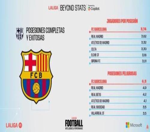 根据西甲官方列出的统计数据,巴萨是本赛季西甲射门转化率最高的球队,也是控球涉及人数、创造威胁次数最多,成功阻止对手射门比例最高的球队。