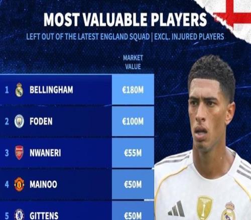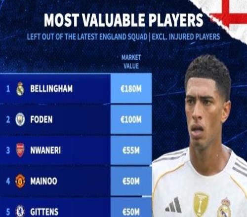 雷速体育10月3日报道宣称 英格兰队公布了新一期大名单,德转盘点了落选本次英格兰大名单的球员身价榜单(不含伤病球员)。具体名单如下:贝林厄姆(皇马)1.8亿欧元福登(曼城)1亿欧元恩