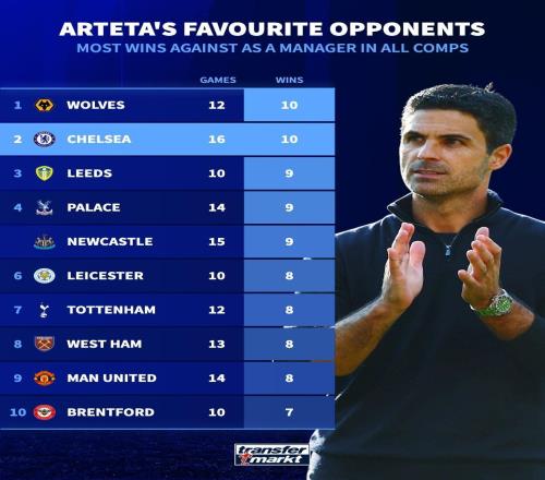 喜欢的对手,切尔西是阿尔特塔赢球最多的球队,16场取得10胜